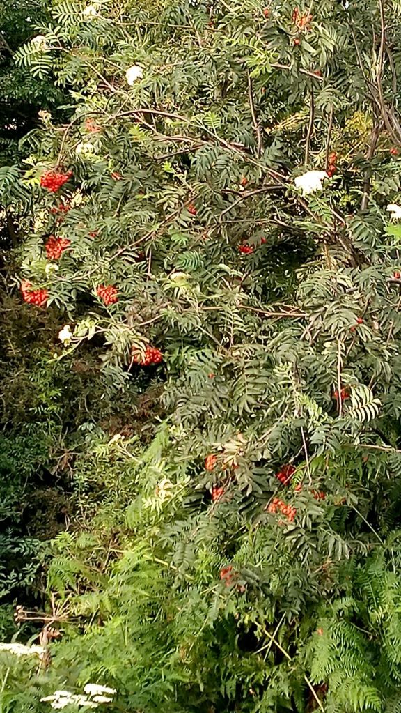 The rowan: white flowers, red berries.
