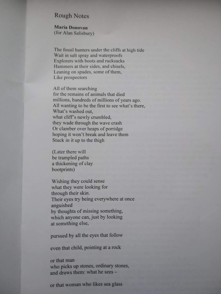 All the while I was considering what to do for ‘Thoughts on Paper’, I had thoughts of Hilary, and how she used to ponder before she could put down a word. Then there was the chance to look through the catalogue of artworks and see what triggered something. The pencil drawings of pebbles by Alan Salisbury brought out all kinds of ideas that mixed with my experiences of fossil hunting on the Dorset coast. The brief was to produce something that would fit on a sheet of A4. That was a help because I could more or less envisage the entire piece before I began to write.